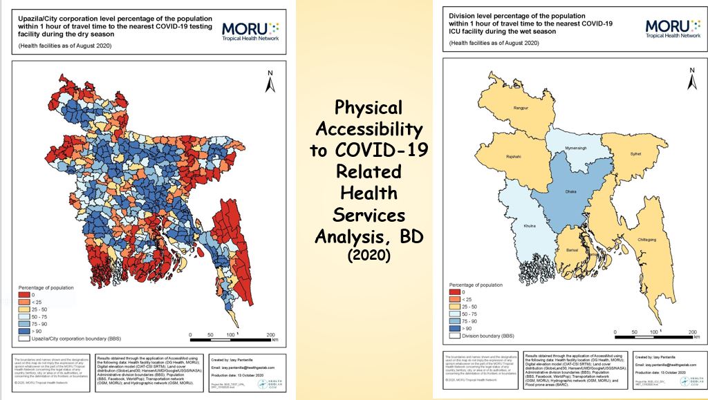 The study aimed to determine the subnational proportion of the population in Bangladesh that can access COVID-19 testing, treatment, and ICU facilities within 1-3 hours of travel time. The AccessMod open-source package was used to estimate these indicators during the dry season in 2020. The results highlight areas where populations have limited physical ac-cess to COVID-19-related health services, and the government should conduct further analyses to improve access. The study also emphasizes the need for regular updates to account for changes in the COVID-19 health services delivery network.