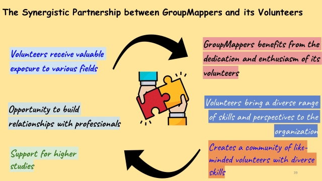 GroupMappers values volunteers for their expertise, unique perspectives, and contributions to its success. Volunteering benefits include learning, networking, and career advancement. Fresh perspectives and abilities can aid in improving workflows and project turnaround times.